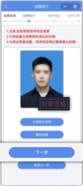 (4)照片初审。在拍摄完成或上传完成后,系统会生成带水印的初审照片,显示初审合格点击下一步,会弹出通知权限请求,请务必允许小程序发送审核结果、订单状态、订单异常提醒通知,避免对采集工作造成不必要的影响。