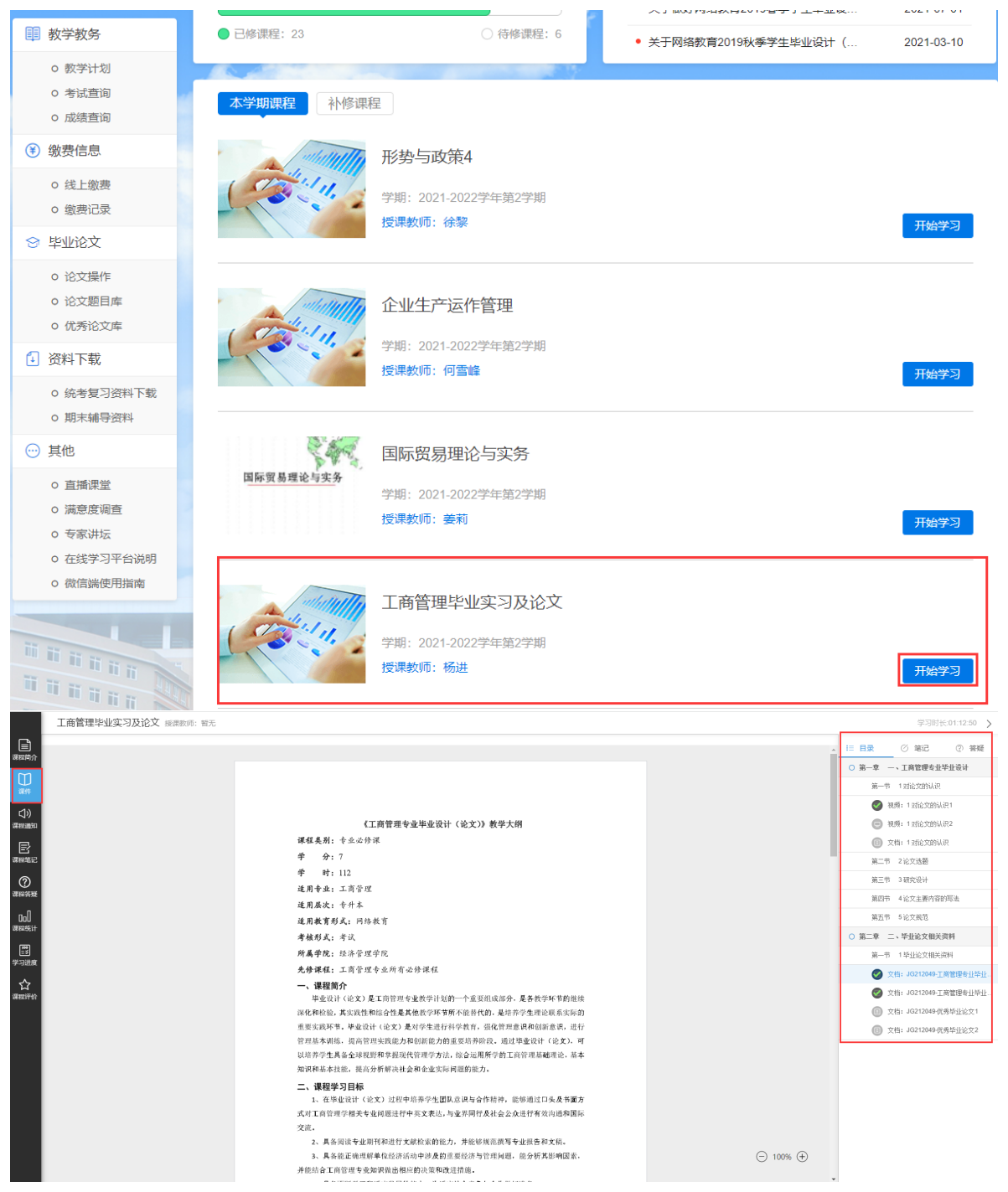 学生登录学生工作室,在本学期课程中,认真学习各专业毕业设计(论文)课件资源,了解毕业设计(论文)教学大纲、毕业设计(论文)撰写指南、学习对毕业设计(论文)的认识、选题要求、论文主要内容的写法,论文规范等相关内容。