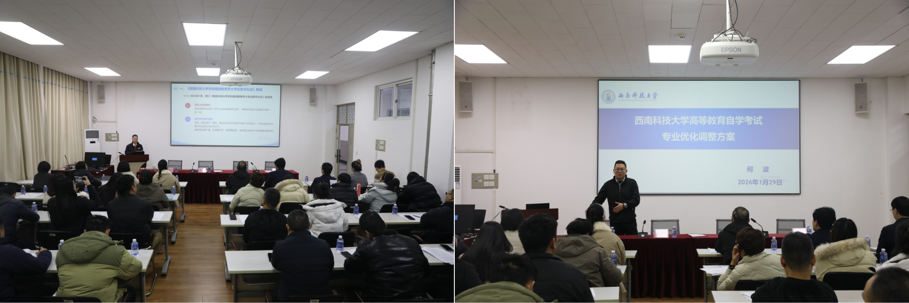 续教育学院院长叶旭首先通报了学院近期机构调整与职能优化情况,明确了学院在新阶段的目标定位与组织保障。副院长冉利龙对《西南科技大学学历继续教育学士学位授予办法》《西南科技大学学历继续教育学术复核办法》等文件进行了解读,重点说明学位授予条件的多元评价体系与学术复核流程,并对2026年上半年学位申请工作作出安排。副院长何波围绕自学考试专业结构优化方案进行阐述,并现场征求与会单位意见。